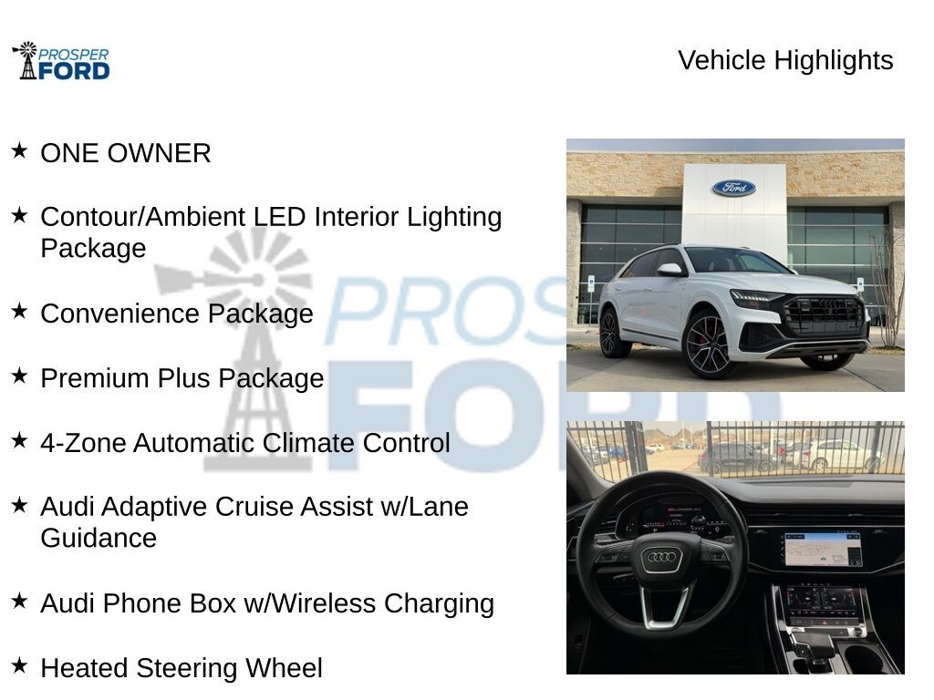 Safety is paramount, and this Audi Q8 is equipped with a comprehensive suite of advanced driver assistance technologies, including Adaptive Cruise Assist, Lane Guidance, and a Top View Camera System, ensuring your peace of mind on the road.
