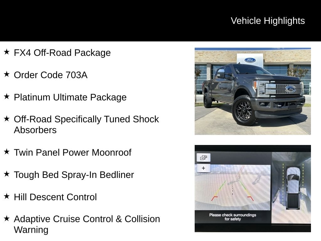 4WD, Adaptive Cruise Control & Collision Warning, FX4 Off-Road Package, Hill Descent Control, Lane-Keeping Alert, Off-Road Specifically Tuned Shock Absorbers, Order Code 703A, Platinum Ultimate Package, Rear CHMSL Camera, Tough Bed Spray-In Bedliner, Twin Panel Power Moonroof, Ultimate Trailer Tow Camera System, Unique FX4 Off-Road Box Decal.