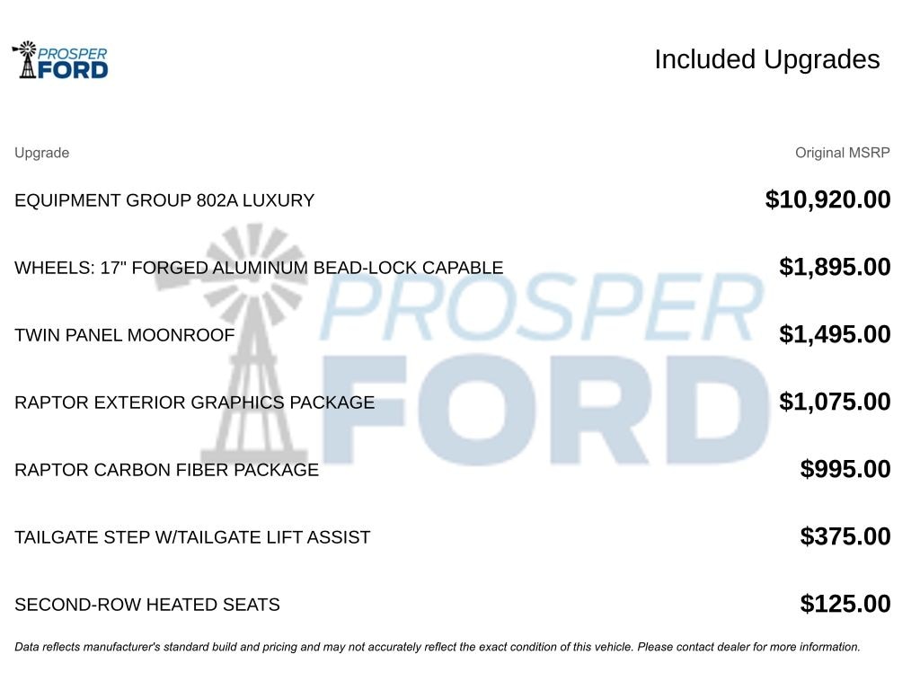 Elevating the Raptor's off-road prowess are the 17-inch forged aluminum bead-lock capable wheels, the Raptor-specific suspension, and the Raptor Carbon Fiber and Exterior Graphics packages, which lend an undeniably bold and distinctive appearance. The Tailgate Step with Lift Assist and the Pro Trailer Backup Assist system further enhance the Raptor's versatility, making it the ultimate companion for your outdoor adventures.