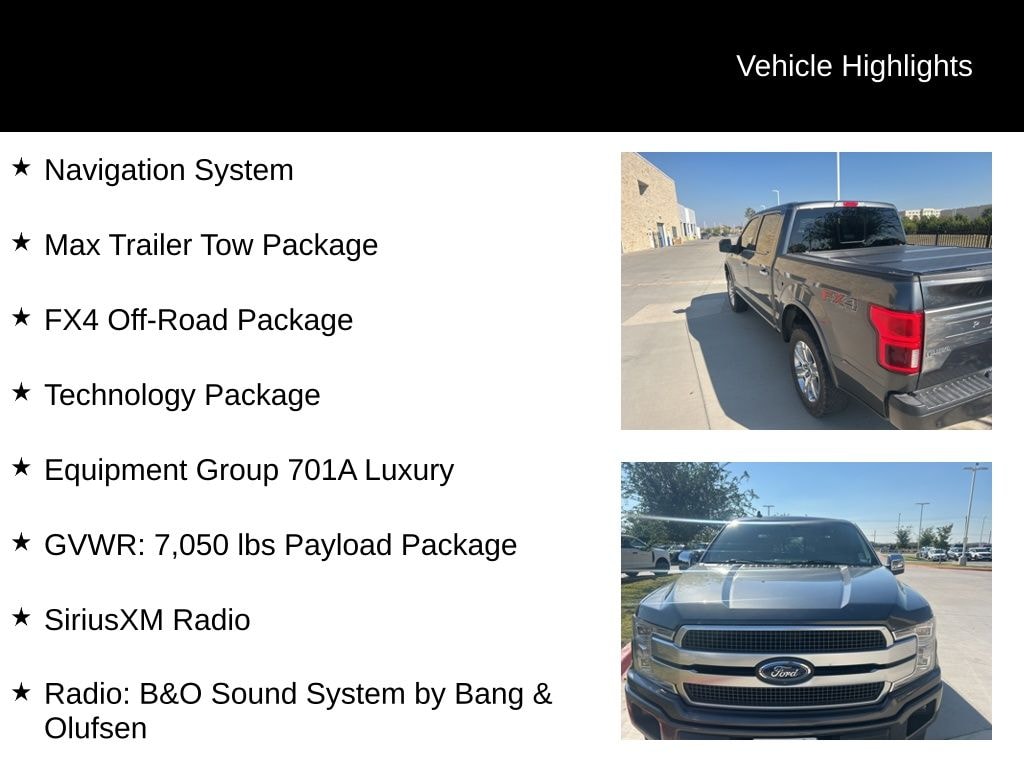 ONE OWNER CLEAN CAR FAX, EXCELLENT SERVICE HISTORY, 4WD, 10 Speakers, 20" Polished Aluminum Wheels, 360 Camera w/Split-View Display, 4-Wheel Disc Brakes, 4x4 FX4 Off-Road Bodyside Decal, ABS brakes, Active Park Assist, Adaptive Cruise Control, Adjustable pedals, Air Conditioning, Alloy wheels, AM/FM radio: SiriusXM, Auto High-beam Headlights, Auto tilt-away steering wheel, Auto-dimming Rear-View mirror, Automatic temperature control, Black Unique Multi-Contour Leather Bucket Seats, Brake assist, Bumpers: body-color, Class IV Trailer Hitch Receiver, Compass, Delay-off headlights, Driver door bin, Driver vanity mirror, Dual front impact airbags, Dual front side impact airbags, Electronic Locking w/3.55 Axle Ratio, Electronic Stability Control, Emergency communication system: SYNC 3 911 Assist, Engine Oil Cooler, Equipment Group 701A Luxury, Extended Range 36 Gallon Fuel Tank, Exterior Parking Camera Rear, Front anti-roll bar, Front Bucket Seats, Front Center Armrest, Front dual zone A/C, Front fog lights, Front License Plate Bracket, Front reading lights, Front wheel independent suspension, Fully automatic headlights, FX4 Off-Road Package, Garage door transmitter, Genuine wood door panel insert, GVWR: 7,050 lbs Payload Package, Heated door mirrors, Heated front seats, Heated rear seats, Heated steering wheel, Hill Descent Control, Illuminated entry, Integrated Trailer Brake Controller, Low tire pressure warning, Max Trailer Tow Package, Memory seat, Navigation System, Occupant sensing airbag, Off-Road Tuned Front Shock Absorbers, Outside temperature display, Overhead airbag, Overhead console, Panic alarm, Passenger door bin, Passenger vanity mirror, Pedal memory, Power door mirrors, Power driver seat, Power passenger seat, Power steering, Power windows, Pro Trailer Backup Assist, Radio data system, Radio: B&O Sound System by Bang & Olufsen, Rain sensing wipers, Rear Parking Sensors, Rear reading lights, Rear seat center armrest, Rear step bumper, Rear window defroster, Remote keyless entry, Security system, SiriusXM Radio, Speed control, Speed-sensing steering, Split folding rear seat, Steering wheel memory, Steering wheel mounted audio controls, SYNC 3, Tachometer, Tailgate Step w/Tailgate Lift Assist, Technology Package, Telescoping steering wheel, Tilt steering wheel, Traction control, Tray Style Floor Liner, Trip computer, Twin Panel Moonroof, Upgraded Front Stabilizer Bar, Variably intermittent wipers, Ventilated front seats, Voice-Activated Touchscreen Navigation, Voltmeter.