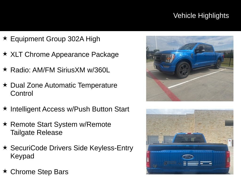 3.5L PowerBoost Full-Hybrid V6, 4WD, 10-Way Power Driver & Passenger Seats, 2-Bar Style Grille w/Chrome 2 Minor Bars, 8" Productivity Screen in Instrument Cluster, Auto-Dimming Rear-View Mirror, Chrome Door & Tailgate Handles w/Body-Color Bezel, Chrome Single-Tip Exhaust, Chrome Step Bars, Class IV Trailer Hitch Receiver, Dual Zone Automatic Temperature Control, Equipment Group 302A High, Heated Front Seats, Intelligent Access w/Push Button Start, Leather-Wrapped Steering Wheel, LED Box Lighting w/Zone Lighting, LED Reflector Headlamps, LED Sideview Mirror Spotlights, Onboard 400W Outlet, Power Glass Heated Sideview Mirrors, Radio: AM/FM SiriusXM w/360L, Rear Under-Seat Storage, Remote Start System w/Remote Tailgate Release, SecuriCode Drivers Side Keyless-Entry Keypad, SYNC 4 w/Enhanced Voice Recognition, Wheels: 18" Chrome-Like PVD, XLT Chrome Appearance Package.