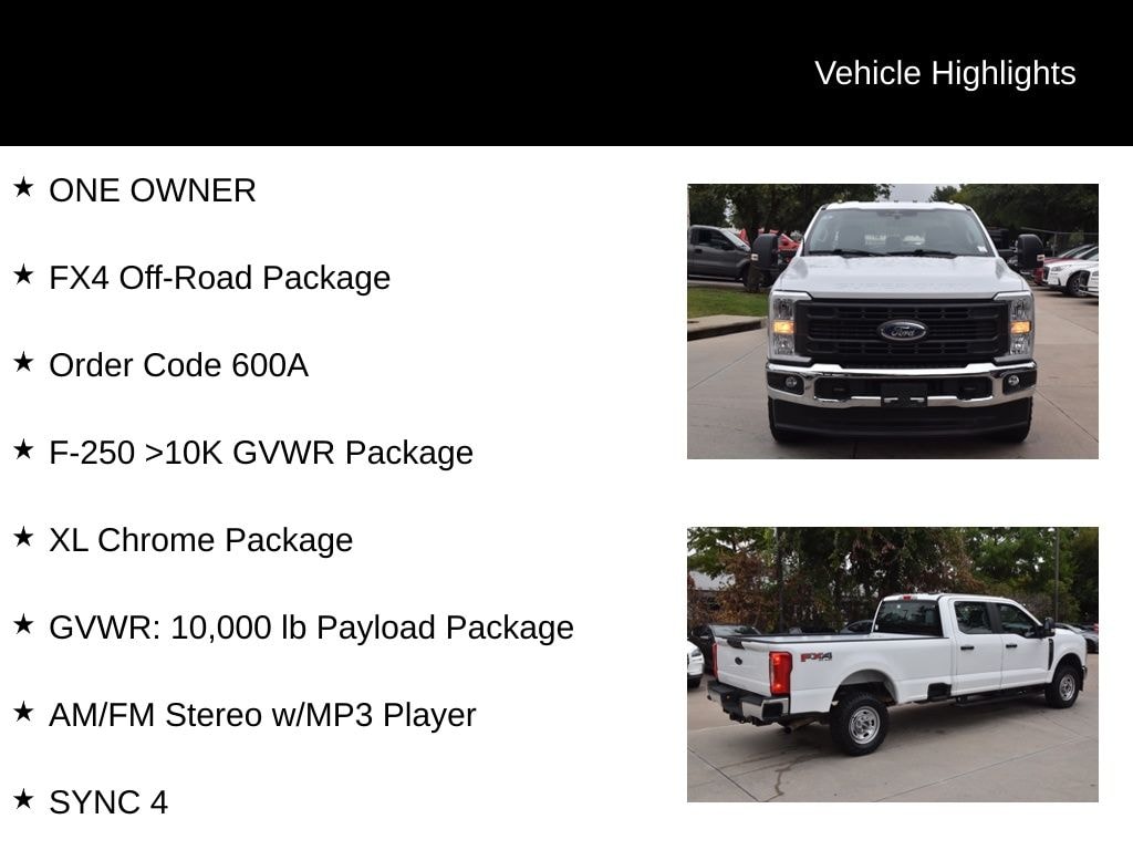 ONE OWNER, CLEAN CAR FAX, 4WD, 17" Argent Painted Steel Wheels, 250 Amp Alternator (Gas), 3.73 Axle Ratio, 4 Speakers, 4-Wheel Disc Brakes, ABS brakes, Air Conditioning, AM/FM radio, AM/FM Stereo w/MP3 Player, BoxLink, Brake assist, Bright Chrome Hub Covers & Center Ornaments, Chrome Front Bumper, Chrome Rear Step Bumper, Compass, Delay-off headlights, Dual front impact airbags, Dual front side impact airbags, Electronic Stability Control, Emergency communication system: SYNC 4 911 Assist, Exterior Parking Camera Rear, F-250 >10K GVWR Package, Front anti-roll bar, Front Center Armrest w/Storage, Front License Plate Bracket, Front reading lights, Front Wheel Well Liners (Pre-Installed), Fully automatic headlights, FX4 Off-Road Package, GVWR: 10,000 lb Payload Package, Halogen Fog Lamps, HD Vinyl 40/20/40 Split Bench Seat, Heated door mirrors, Hill Descent Control, Illuminated entry, LED Roof Clearance Lights, Low tire pressure warning, Off-Road Specifically Tuned Shock Absorbers, Order Code 600A, Outside temperature display, Overhead airbag, Overhead console, Panic alarm, Passenger vanity mirror, Platform Running Boards, Power door mirrors, Power steering, Power windows, Rear reading lights, Rear step bumper, Remote keyless entry, Remote Start System, Speed control, Split folding rear seat, Steering wheel mounted audio controls, SYNC 4, Tachometer, Telescoping steering wheel, Tilt steering wheel, Traction control, Trip computer, Turn signal indicator mirrors, Unique FX4 Off-Road Box Decal, Upfitter Switches (6), Variably intermittent wipers, XL Chrome Package.
