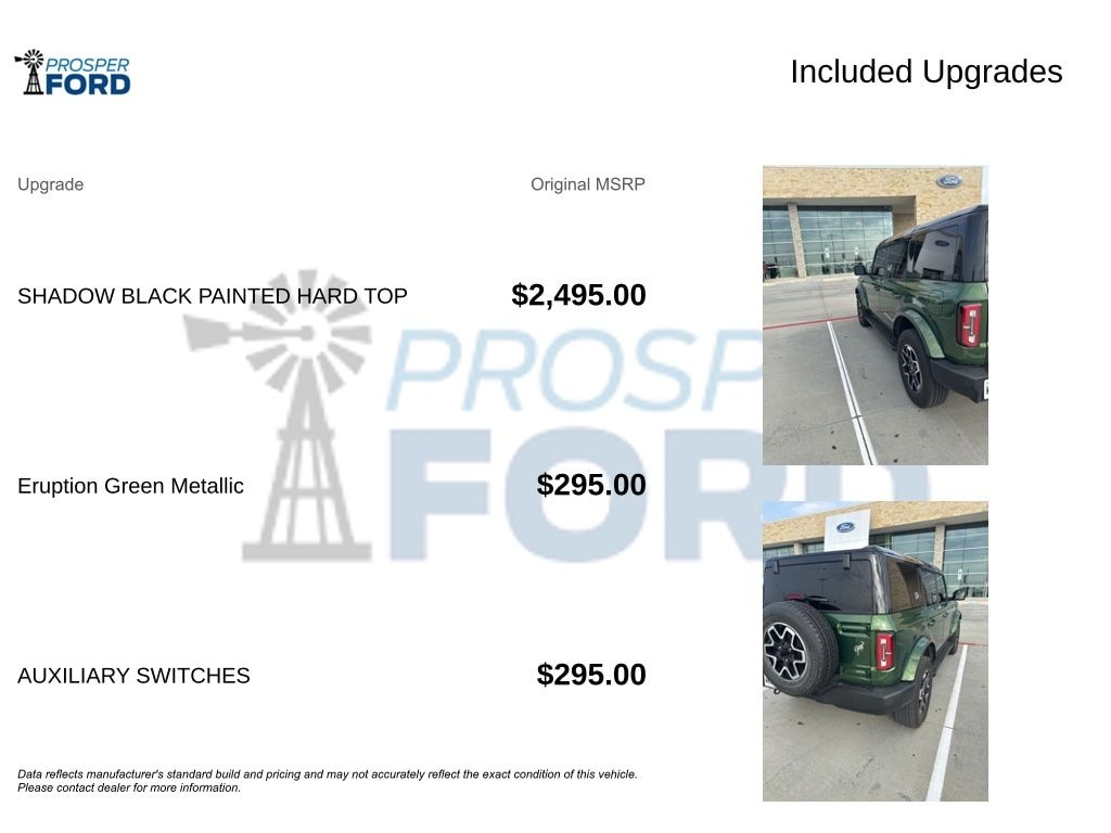 This Bronco Outer Banks is a true standout, with its striking Eruption Green Metallic exterior and thoughtfully designed features. The Shadow Black painted hard top, auxiliary switches, and front row top panels storage bag demonstrate the Bronco's commitment to versatility and customization.