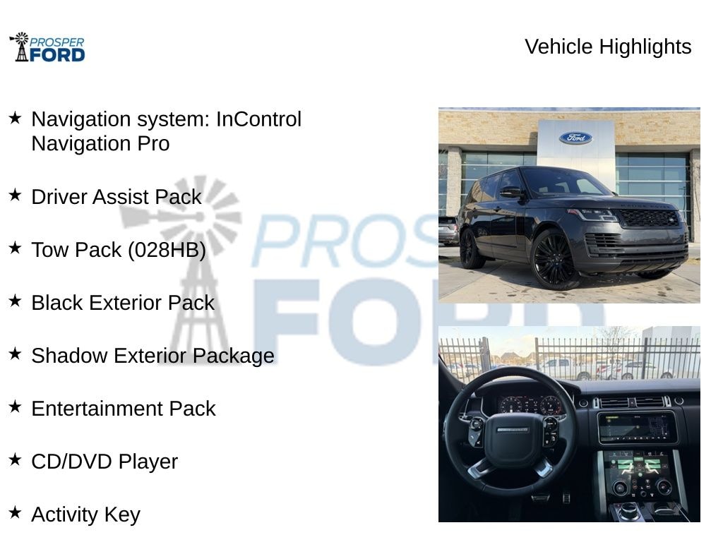 The exterior of this Range Rover is enhanced with the exclusive Black Exterior Pack, Shadow Exterior Package, and a host of Narvik Black and Shadow Atlas accents, creating a bold and striking presence. Step inside the cabin and you'll be surrounded by the finest materials, including genuine wood trim and perforated Windsor leather seating.