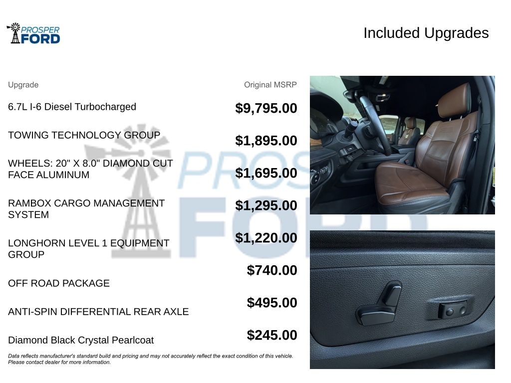 - Longhorn Level 1 Equipment Group (Blind Spot & Cross Path Detection, LED Bed Lighting, Power Deployable Running Boards, 12" Touchscreen Display, Ramcharger Wireless Charging Pad, Radio: Uconnect 5 Nav w/12.0" Display, MOPAR Spray In Bedliner, 17 Speaker harman/kardon Premium Sound)